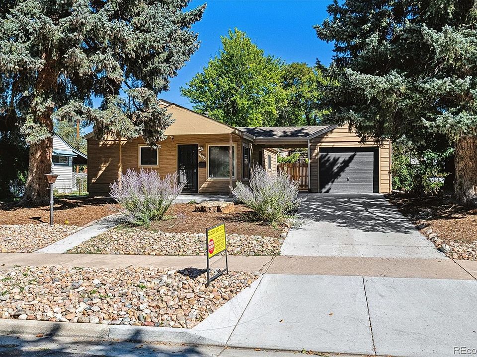 Tastefully remodeled home in University Hills. Rare ranch style with a finished basement situated on a large elevated lot in University Hills. Open floor plan, light and bright with lots of updated double pane winidows and window blinds. Enter the home through the main front door protected by a large covered patio area and into the homes foyer and family room with ivesized picture windows. Just off the main family room is an eat in kitchen (perfect space for a nook table), upgraded kitchen cabinets, slab granite countertops, tiled kitchen backsplash, stainless steel appliances including a gas stove. Fully remodeled bathroom with custom tiled floors and tub/shower surround and bathroom fixtures. Two large bedrooms. NO CARPET, site finished hardwood floors throughout the entire main level. Easy access to the finished basement through an exterior door or just off of the kitchen. Enter into a huge great room area flanked by a large bedroom (window is not eggress) and a large laundry room/storage area with washer, dryer and utility sink. Quarter bathroom. The entire the basment has updated LVP flooring. Updated lighting, plumbing and lighting and hardware fixtures througout. Huge private professionally landscaped lot, fully fenced in with mature trees and plants, front and back sprinkler system and storage shed. Large detached garage with overhang connecting to the house. Lots of upgraded systems including maintenance free vinyl siding and soffits, newer concrete driveway, porch and sidewalks, HVAC, Central A/C, roof and electrical. Close to everything including shops, reataurants bars, parks, schools, major highways including I-25, HWY 285, I-225 and minutes to Downtown, Cherry Creek, DTC, Park Meadows plus much more!!!