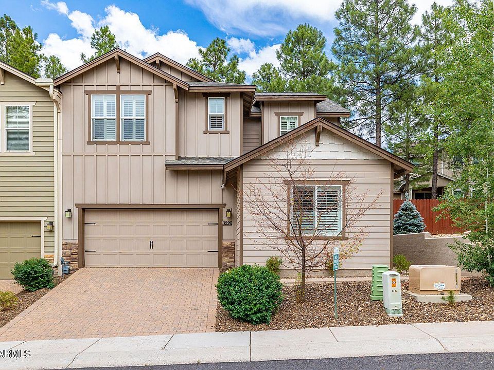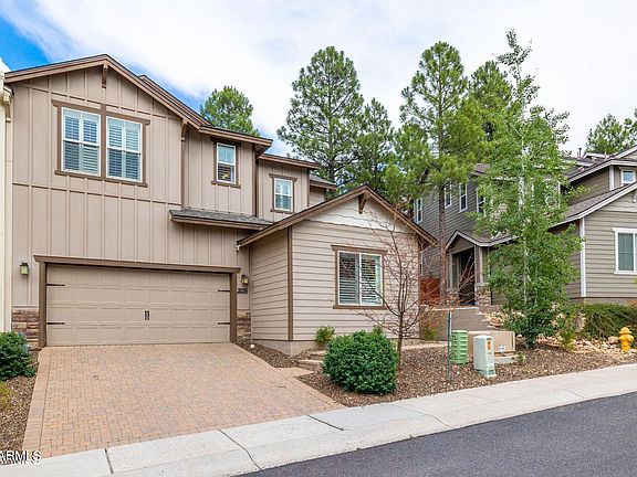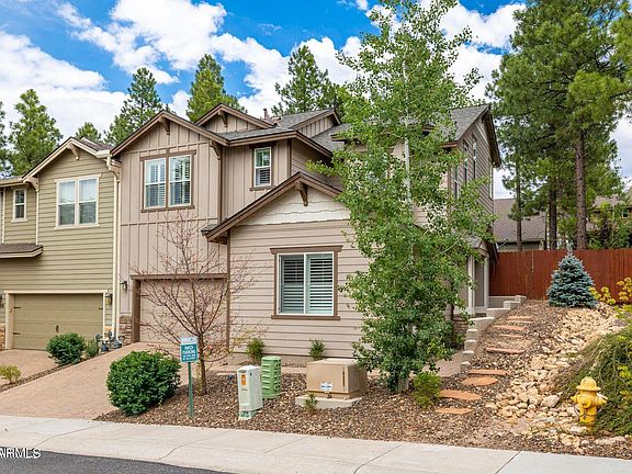 This upgraded townhome is in the highly desirable neighborhood of Pinnacle Pines. Includes soaring ceilings, natural light, stainless steel appliances, breakfast bar, granite counters, plantation shutters, hardwood floors, and a rock fireplace. This end unit has central air & heat, an oversized, spacious fenced in back yard with putting green, beautiful landscaping, BBQ grill, dining area & fire pit. Enjoy mountain views & hiking trails from this perfect lock & leave. 5 minutes to shopping & restaurants in downtown Flagstaff & only 20 minutes to Snowbowl. Great summer escape from the heat in the valley or year round living. Furniture, furnishings, TV's w/ sound bar available on a separate bill of sale (except a few personal items) . Cozy & clean. Priced to sell.