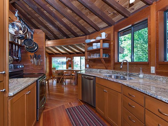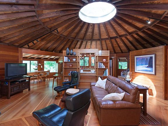 A once in a lifetime opportunity! Secluded paradise, perfect location for premier hiking & biking. Two beautiful round homes boasting brazilian cherry & fir wood floors, 5'' & 6" skylights, updated kitchen, stainless appliances, slate entries, pellet stoves, ductless HPs, all wood windows, built-in shelves, Custom 1/4 mile hiking trail, multi-level decking, A-frame storage cottage, 7 minutes to Market of Choice, next to Ridgeline Trail!