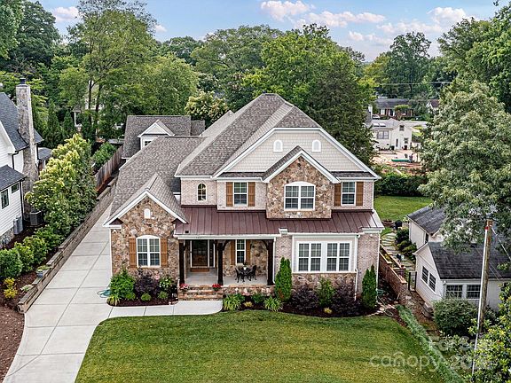 Welcome home to this beautiful custom built home completed in 2020 in Myers Park. This home is move-in ready offering 4,793 square feet of gorgeous living space. After entering into the 2 story foyer to your left is the formal living room/office, dining room featuring a vaulted ceiling, wide crown moulding, & sophisticated columns. The inviting open floor plan features a kitchen w/granite counters, eat in bar, and dining area. The family room with gas fireplace, built in's, sound system, and large windows overlook the flat back yard providing wonderful views. Just outside is the covered patio with skylights. Retreat to the 1st primary bedroom with its tray ceiling, dual walk-in closets, and marble spa-like bathroom. Highlights include main level primary bedroom and guest suite, multiple flex spaces, 2 car detached garage with finished space including kitchenette & bathroom. Minutes to Park Road Shopping Center, greenway and quick commute to uptown making this location second to none!