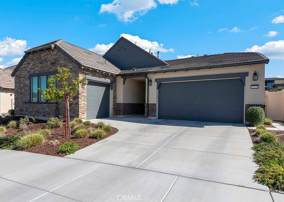 Luxury, single-story home in the highly sought-after 55+ gated community of Esplanade at Sommers Bend, showcasing over $100,000 in interior upgrades, and fully paid-off solar. The entry opens to wide plank wood flooring that flows through the hallways, kitchen, and family room, all enhanced by recessed lighting. The kitchen is a true showpiece with quartz countertops, a custom tile backsplash, shaker cabinets—two with elegant glass doors—and an oversized center island with large overmount sink and walk-in pantry. The kitchen opens to the dining room and family room, anchored by a sleek built-in fireplace and adorned with plantation shutters, creating a warm, elevated feel. The primary suite offers plush carpet underfoot and leads to a luxurious bathroom with custom tile flooring, dual vanities, a soaking tub, and a walk-in shower with beautifully tiled walls and upgraded finishes. Two additional bedrooms and a full guest bath are thoughtfully situated for privacy and flexibility. Double sliding glass doors lead to a stunning backyard oasis—complete with a California room, extended patio cover, recessed lighting, ceiling fans, low-maintenance turf, and over 120 feet of custom retaining wall. In addition to the extensive interior enhancements, the homeowners have invested approximately $65,000 in thoughtfully curated backyard landscaping upgrades, creating a truly serene and private retreat. A storage shed adds practical outdoor functionality. The home includes a two-car garage plus a separate one-car garage, perfect for a workshop, gym, hobby space, or additional storage—offering the flexibility to fit your lifestyle. Enjoy world-class community amenities including a pool, spa, pickleball, bocce, clubhouse, fitness center, game room, and scenic walking trails with breathtaking hot-air balloon views.