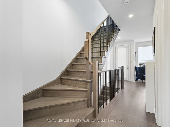 A One-of-a-Kind FREEHOLD Townhome in a Sought-After Community, Exceptional in both design and scale, this beautiful three-bedroom home stands apart as the largest and widest floorplan in this exclusive ten-residence enclave. Every detail has been carefully chosen, creating a bright, refined living space filled with natural light from its extra-large windows. The exterior blends brick, stone, and stucco with a striking 8-foot modern entrance door. Inside, you'll find 9-foot ceilings on every level, 8-foot solid interior wood doors, upgraded trim, and hardwood floors throughout no carpet anywhere. The custom kitchen is the heart of the home, featuring soft-close cabinetry, quartz countertops and backsplash, a waterfall island with undermount sink, KitchenAid appliances including a gas stove, and a built-in beverage fridge. The open-concept living area flows seamlessly and features a gas fireplace and Juliette balcony, creating a space that feels both stylish and inviting. The oak staircase with metal pickets and Hunter Douglas blinds continue the homes attention to detail. Upstairs, the primary suite offers a spa-like retreat with heated floors, a frameless glass shower, and double comfort-height vanities. Additional thoughtful upgrades such as custom closet organizers, LED pot lights, and a full-sized washer and dryer finishes the space beautifully. The appeal extends outdoors with a rare 375-square-foot rooftop terrace finished in cedar and complete with a gas line for barbecuing perfect for relaxing or entertaining under the open sky. Additional conveniences include inside garage entry, a large window in the garage, a covered second parking space, and an owned hot water tank. Located close to Downtown Burlington, shopping, schools, parks, the Burlington Centennial Bike Path, public transportation, major highways and the GO Train. This is a home worth seeing... you will truly be impressed.