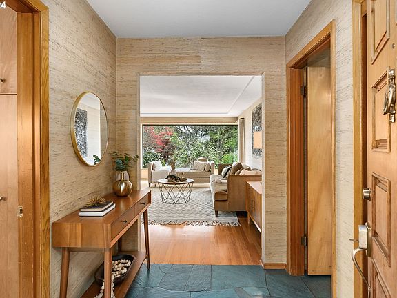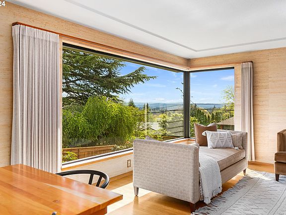 Elegant Mid Century Modern in Hillsdale. Space/rooms for everyone and everything in this 5BR/3BA, 2nd owner home. Meticulously cared for and respectfully updated/renovated to preserve original MCM features. Spacious eat-in kitchen with generous storage in remodeled Kitchen with new cabinetry, quartz counters and stainless appliances. Sunny Living Room with gorgeous hardwood floors and large picture windows with territorial views. Beautiful MCM fireplace with generous hearth is another focal point of this generous space. Formal Dining Room with access to covered patio and beautiful landscaped yard with graceful, meandering paths. Additional access to covered patio between kitchen and garage gives easy access for summer BBQ's. 3BR/2BA on main floor. Primary suite with remodeled bathroom has large soaking tub and built-in lighted mirror. Respectful renovation of original MCM Hall Bath on main. Daylight lower level features 2 additional bedrooms and the 3rd (retro MCM) bathroom. Large Family Room with 2nd fireplace and exterior entry/exit to 2nd backyard/side yard space ready for your summer garden? fire pit? You decide! Storage room with cedar closet and laundry room with additional storage round off the lower level. Newer roof, gutters, exterior paint, sewer (2018), water service line (2019), tank decommissioned (2015), AC (2018) most windows replaced with new double pane. Easy access to Downtown, OHSU, Tech Corridor, walking trails and Hillsdale (Farmers Market, Shopping, Restaurants, Library, Pool, Parks). This could be your new home! [Home Energy Score = 4. HES Report at https://rpt.greenbuildingregistry.com/hes/OR10226887]