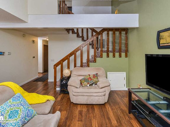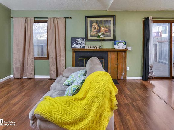 Warm up by the fireplace in this cozy starter home. Open living/dining with new laminate floors downstairs and a sliding glass door opening to fully fenced backyard. Two large bedrooms upstairs. Dues INCLUDE CABLE! Close to JBER, UAA , Hospitals and bike paths. Don't miss this one!