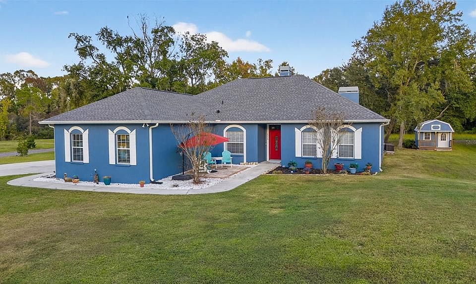 Welcome to this beautifully updated 3-bedroom, 3.5-bath, 2,155 sq ft pool home with an office/bonus room and attached 2-car garage, privately situated on 3.69 acres at the end of a peaceful cul-de-sac. This property offers space, flexibility, and comfort surrounded by serene conservation views. The split floor plan includes two spacious primary suites with pool access, walk-in closets, and private baths, along with a third bedroom featuring its own full bath. The open-concept kitchen and living area were fully remodeled in 2022. Boasts quartz countertops, a double waterfall island, tall soft-close cabinetry, LG stainless appliances, and a striking three-sided fireplace. Additional features include wood-look tile throughout, wider doorways, a soundproof office with French doors, and a convenient laundry room. Major updates such as a new roof and AC (2023) offers a lasting peace of mind. Outdoor living shines with a screened lanai featuring mounted TVs, a heated saltwater pool, paver patio, Paradise Grill island, and fire pit. The newly poured 2023 concrete driveway provides ample parking for RVs, boats, or extra vehicles and leads to a detached garage bay. Two versatile outbuildings: a finished barn-style workshop with storage and A/C, and a guest cottage/office complete with heating, air, and a charming front porch, perfect for guests, a studio, or business space. Surrounded by nature with a wooded conservation area and pond, this home offers the perfect blend of privacy, versatility, and modern comfort. Just 5 miles to I-4 and 2 miles from the Lakeland mall.