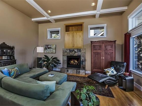 Large widows brighten the living area with natural light & boxed beam woodwork highlights the 12' ceilings. The kitchen features granite tile counter tops, alder cabinets, stainless steel appliances & white oak flooring. Off of the kitchen enjoy the sun washed mahogany deck for morning coffee or grilling in the evening. This home provides great separation & privacy, for easy living the master bedroom is on the main floor as is the laundry. The garage is oversized w/cabinets great for storing tools & toys.