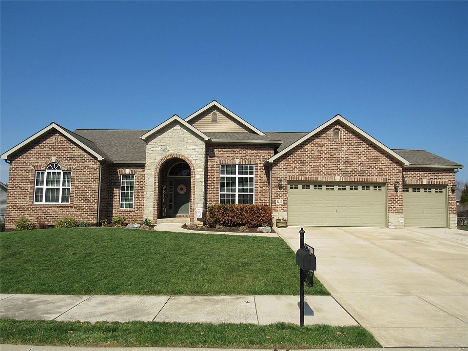 Backup offers welcomed. Truly stunning home with showmanship throughout! From the charming vision of its curb appeal with the brick and stone front, curved entry to the front door, and maintenance free landscaping, to the covered patio and backyard, you'll enjoy every inch of this custom home. Brazilian hardwood through the entry foyer, living room, kitchen, and hearth room. New carpeting being installed in bedrooms. Gourmet kitchen will be a welcoming center to your home w/beautiful cabinetry, oversize central entertainment island, and so much storage. This lovely room also has space for a breakfast table as it flows into the hearth room with stone fireplace. The outstanding lower level is finished with a recreation/family room, 4th bedroom, 3rd bathroom, office, storage, and exercise space Easy access to Scott AFB, hwy. access, even a nearby fresh produce shop behind the neighborhood. It's definitely the show home of this terrific neighborhood! Freeburg schools!