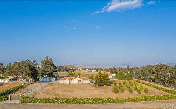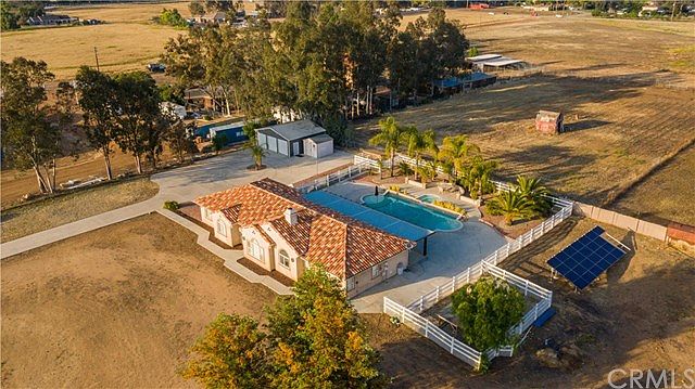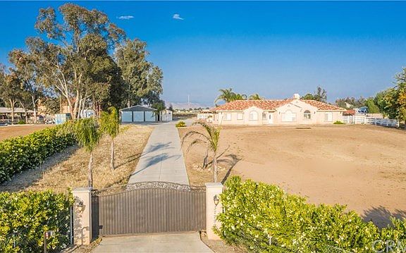 Ready for luxurious living? Mansion living in the heart of Menifee on 2.27 Acres. This home offers amazing views! Featuring Living Room with wood burning fireplace. Gourmet Kitchen with island, 6 burner Wolf professional stove, large walk-in pantry and self-closing kitchen cabinets. Three large bedrooms with walk-in closets and separate bathrooms. All bathrooms have marble and granite counter tops with their own bidet. Separate Den that can be turned into 4th bedroom and large separate Office which can be utilized as 5th bedroom. Indoor Laundry room. Large garage which has been transformed into recreational & exercise room. Upgrades include: water softener system, solar panels, security system with built-in cameras, Insta-hot heater, surround sound, plantation shutters, bamboo flooring in bedrooms and beautiful porcelain tile throughout. Back Yard Oasis features saltwater pool, 12 person spa, fire pit and large alumwood covered patio. All useable acres can be your very own Horse Property. To the right of the estate you will find 50 fruit trees with their own drip system. Property offers a silo feeder, area for arena and extra side entrance for easy deliver of hay. Entire property is fenced attached to a wrought iron electric gate w/keypad for extra security. 3 car garage + storage shed. This estate has lots of parking for your RV and toys. Home is located near shopping centers, movie theater, Paloma High School and I-215. See it today! Won't last!!