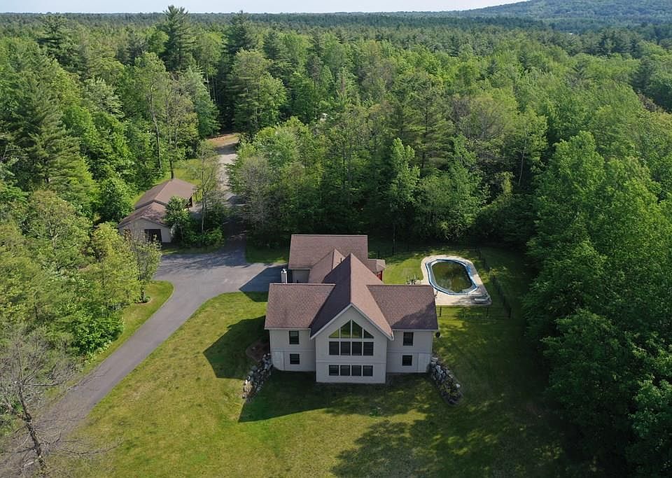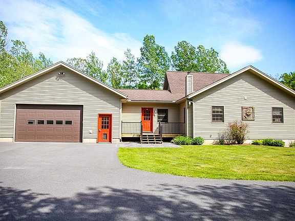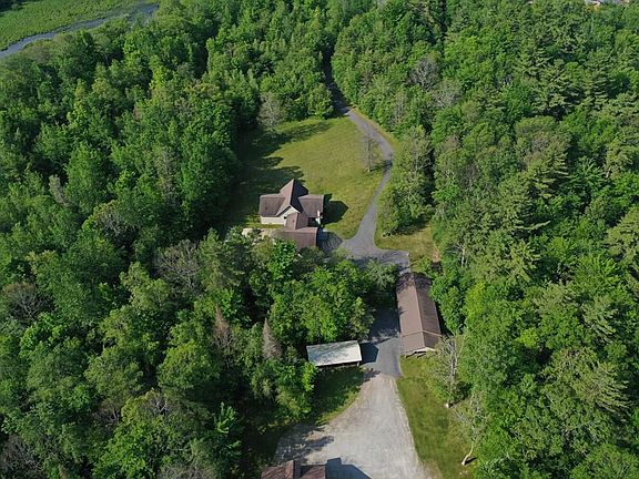 Private Adirondack Retreat on over 24 acres! 5 bd. 3.5 ba home. Private yard and plenty of woods for enjoying nature! Stamped concrete patio around in-ground pool. Open concept living, beautiful Adirondack touches including cathedral, knotty pine ceiling. Hardwood floors in kitchen & dining room, tile flooring in the bathrooms. Stainless steel appliances, pantry. Single floor living on the first floor includes Large primary bedroom with ensuite bath and walk-in closet, 2nd full bath & 2 additional bedrooms & tiled laundry room. Finished basement has tons of natural light, 2 bedrooms with full bath and spacious den. Great storage throughout. Attached 2 car garage, plus numerous other outbuildings, including 2 additional garages, 2 pole barns/sheds, boat storage pavilion. Multi-room garage/workshop with unfinished space above, so many options for use. Wood boiler hook up exists as well if buyer prefers. Close to Augur Lake, Lake Champlain, hiking, fishing & more!