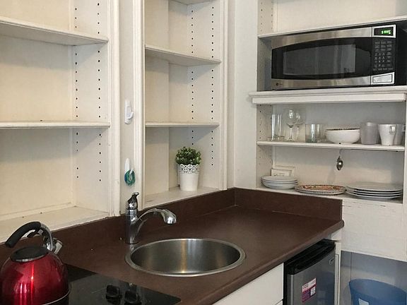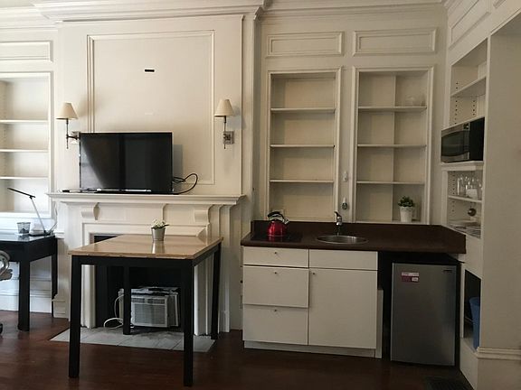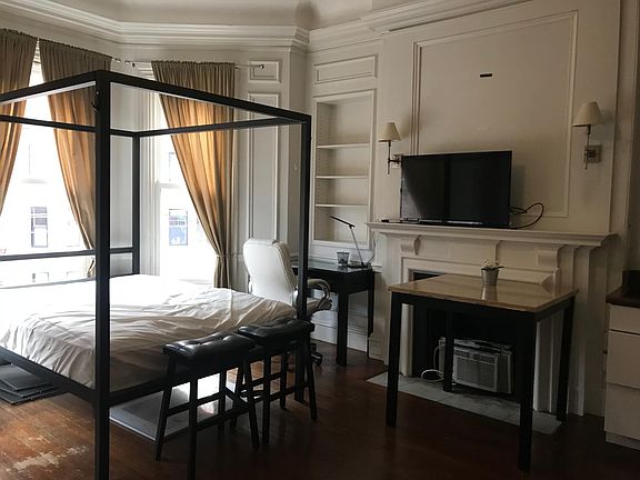 Tastefully furnished studio apartment with flexible lease terms. Heat, hot water, and electric included in the rent. Apartment features large bay windows, extremely high ceilings, hardwood floors, bathroom with large walk in shower, kitchen with 2 hot plates, and shared laundry in the building! Air conditioning unit supplied, large closet with storage space on top! Call now for a showing!