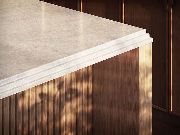 The bathrooms at Bergen are outfitted with soft tones and warm wood accents that make for a spa-like oasis with materials that are crafted to last. The bathroom is adorned with honed Crema Vanilla marble wall and floor tiles, a custom white oak vanity with Crema Vanilla marble countertop, legs and ledge, and a soaking tub clad in honed Crema Vanilla marble at the deck and skirt. Finishing touches include radiant heated floors and custom light fixtures by Workstead.