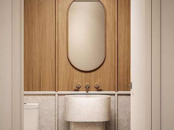 The bathrooms at Bergen are outfitted with soft tones and warm wood accents that make for a spa-like oasis with materials that are crafted to last. The bathroom is adorned with honed Crema Vanilla marble wall and floor tiles, a custom white oak vanity with Crema Vanilla marble countertop, legs and ledge, and a soaking tub clad in honed Crema Vanilla marble at the deck and skirt. Finishing touches include radiant heated floors and custom light fixtures by Workstead.