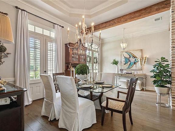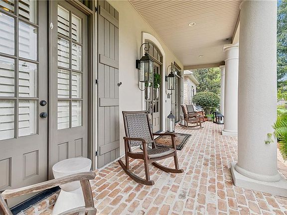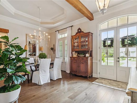 This timeless French country home situated on an oversized corner lot is classically designed and handsomely appointed. Too many details to list, but don't miss the inviting den with cypress beams, Chicago brick fireplace with beam mantle flanked by built-in shelving, floor-to-ceiling windows and French doors, European Oak wood flooring and formal dining room with tray ceiling and a beautiful chandelier. The chef’s kitchen which opens to the den and breakfast room features gorgeous countertops, subway tile backsplash, center island with expansive high-top breakfast bar, lighting upgrades and premium appliances including 6 burner cooktop, professional hood, wine cooler, ice maker, pot filler and more. There is also a butler’s pantry and coffee bar! The sunny breakfast room overlooks the private beautiful backyard sanctuary. (You'll live outside on the covered brick patio overlooking the in-ground pool with chiller, fountains, and tanning ledge). The primary suite features the bedroom with a tray ceiling and windows overlooking the rear yard and pool and spa-like bath with a frameless glass shower and soaker tub. So many extras: custom drapes + shades, large upstairs bonus room, whole-house generator, irrigation system, security system, golf cart garage, 3 year old roof and so much more! Flood Zone C. Look no further, you're home!!!