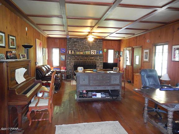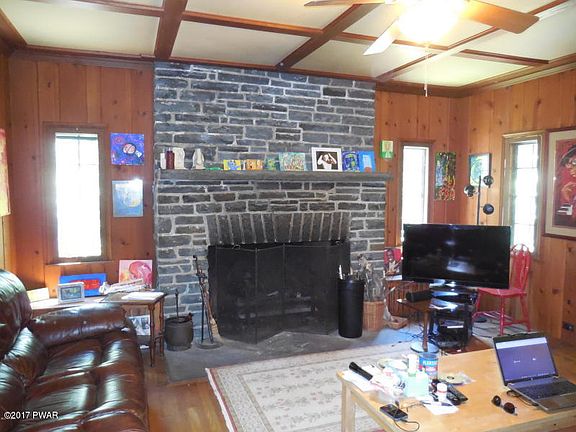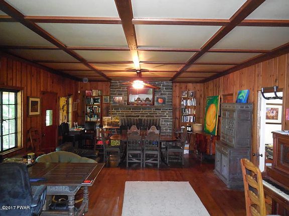 24.47 acres with Private Pond-This is a one of a kind property with vintage hunting lodge and additional cabin on 24.47 ultra private acres. Lodge features covered stone porch overlooking 2-acre mountain pond, 3 bedrooms, full bath, craftsman style great room with two massive fireplaces at either end, full basement and detached two-car garage. This property is situated on top of the mountain surrounded by thousands of acres of Delaware State Forest, but only minutes to downtown and train to NYC.