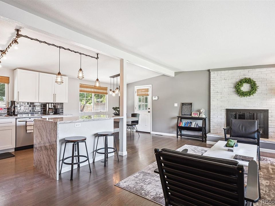 - Description: Hardwood Floors, Marble Countertops, Subway Tile Backsplash, Waterfall Countertop Island With Bar Seating And Under Counter Mircowave, Industrial Style Pendant Lights, Stainless Steel Appliances, Gas Stove, Open To The Living Room And Dining Room