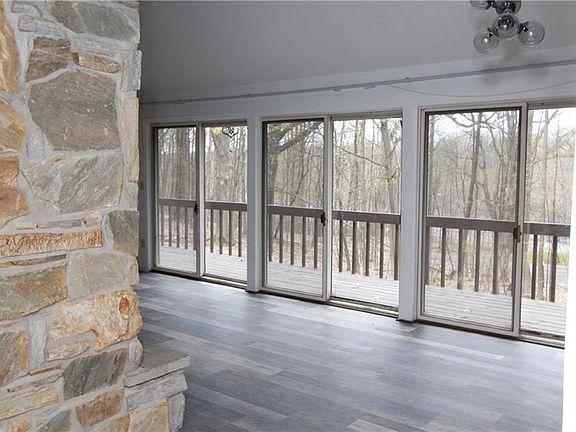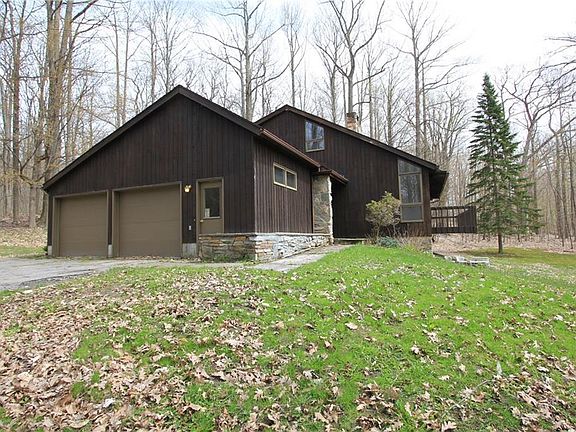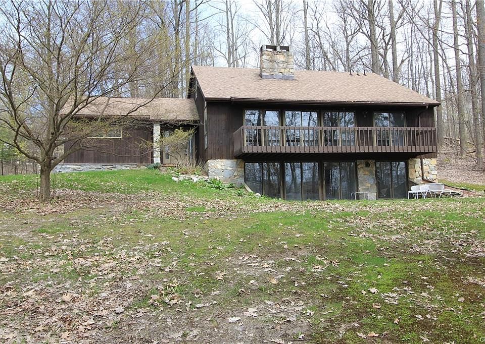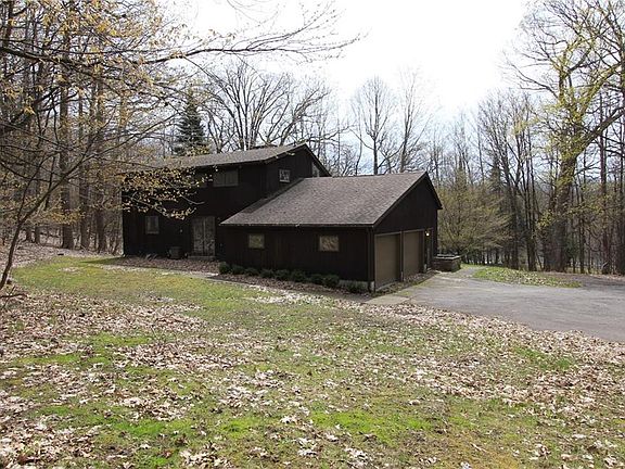 Spacious contemporary home on 1.4 acres. The large entry way leads into a huge living room with a massive Italian stone double sided fireplace, which extends to the vaulted ceiling. The wall of sliding glass doors leads to a deck which overlooks the wooded front yard and a view of the river in certain seasons. Through the wide arched opening is the combined kitchen dining area with a view of the fireplace. A sliding glass door provides access to a patio, great for grilling and entertaining. The master, a den/study and full bath complete the first floor. The basement has a wall of sliders, a fireplace, and a wet bar, providing great space for family and friends. There is also a sauna and 3rd full bath. Come put your personal touch on this wonderful family home!