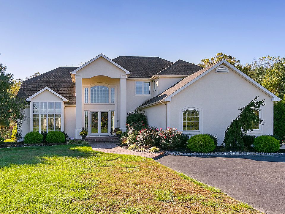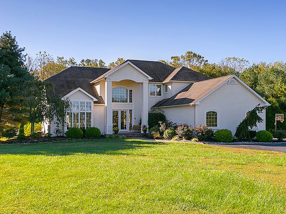 This beauty is not to be missed if you desire privacy and acreage! This sprawling property is situated on 4.85 acre home site with the most gorgeous setting backing to woods and stream! The open soaring entry welcomes you with ceramic tile flooring, warm hardwoods in LR & DR including custom moldings and fresh designer paints! The kitchen is just wonderful with gorgeous granite counter tops, tumbled marble back splash, stainless appliances, recessed lighting and a wonderful bright breakfast room with panoramic view! The spacious family room includes a stone fireplace, floor to ceiling ANDERSEN casement windows to view your rear yard paradise complete with heated GUNITE pool/spa, paver patio, deck and shed! The owners suite offers a romantic balcony retreat, tray ceiling with recessed lighting and ceiling fan, and a large ceramic tile bath with over sized shower, Jacuzzi and custom walk-in closets with cherry cabinetry built-ins to keep you organized! You'll find a first floor study with a nearby FULL bath! The additional bedrooms are all very generous in size one is a junior suite with it's own private bath the other 2 share a jack & jill bath! The basement is partially finished perfect for media and or play room plus still plenty of room for storage! Serviced by Clearview Regional School, conveniently located near Rt. 55.