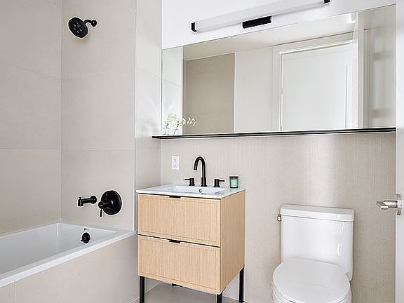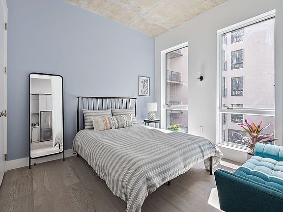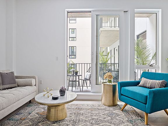Comprised of 47 unique one and two-bedroom homes, 45 of which feature significant private outdoor space. Interiors are framed by up to 10' exposed concrete ceilings, floor-to-ceiling sound attenuated windows, and ash gray, wide plank, European oak flooring. Each layout offers a thoughtful balance of scale, utility, and flow. Kitchens are appointed with full-height, custom matte grey lacquer cabinetry, brushed stainless LG refrigerators with bottom freezer, integrated Blomberg dishwashers, and a 4 burner Blomberg gas range. Baths incorporate either glass-enclosed showers or Kohler soaking tubs, and neutral toned floors and wet walls in large format porcelain tile. Full width mirrors, custom storage vanities, and contrasting matte black fittings complete the package.