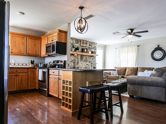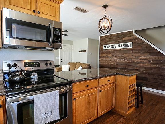 TURNKEY B&B on 2 acres just a few minutes from town! Adorable flagstone property, complete with furnishings and future bookings. 3 bedroom 2 bath home completely furnished in charming Texas style. The property boasts a hot tub, outdoor stone fire pit, indoor rock fireplace with comfortable sitting area, granite counter tops, new appliances and more.. Many popular wineries are only 5 minutes away and the iconic town of Luckenbach is only 3.5 miles away! Enjoy fruit from your own orchard in late spring, early summer. Full kitchen and open living concept with wood floors and wooden accent wall.