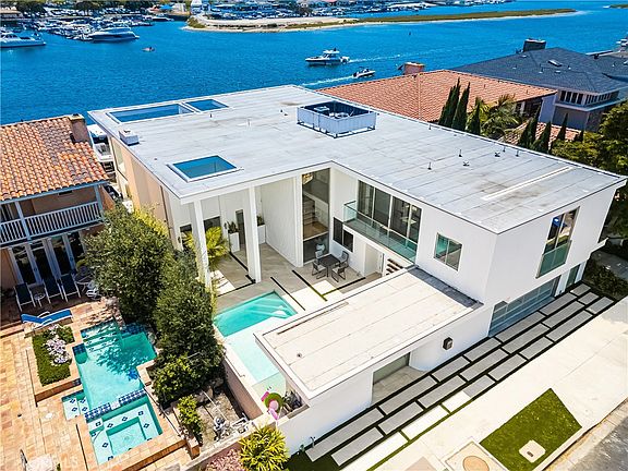 Introducing the ultimate Waterfront Back Bay Estate in the prestigious Dover Shores community in Newport Beach. This world-class home has been professionally designed and masterfully constructed with the highest quality finishes rarely found elsewhere, offering the ultimate lifestyle. Ideally situated on a spectacular 6,000 sq. ft. lot, the home features an impressive 60 ft of frontage offering unobstructed, sweeping 180-degree views that are truly unmatched. The entry into the residence begins with a large glass pivot door into the private courtyard showcasing a tranquil pool, sitting area and show stopping 30 ft backlit feature wall. Spanning nearly 5,000 square feet, the home features five (5) ensuite bedrooms highlighted by the primary suite with private balcony overlooking the water. A waterfront glass-walled media/game room has an ensuite with an infrared sauna. On the main level, the jaw dropping expansive kitchen is a true centerpiece, flowing effortlessly into the sleek family room, sophisticated dining space and open-concept living room, all framed by dramatic floor-to-ceiling glass. Walls of glass dissolve the boundary between indoor and out, creating panoramic unobstructed views of Newport Beach’s iconic Back Bay. Highlights of the home include substantial 4 ft square porcelain tile flooring throughout the interior and exterior spaces, white oak flooring in each bedroom suite, custom oak cabinetry, hand-cut imported stone kitchen countertop, top of the line Gaggenau appliances, Restoration Hardware lighting and Graff bathroom fixtures - to name a few. The rear terrace is equally impressive featuring a tremendous outdoor patio with firepit, spa, bbq and both lounging and dining spaces. Additional features include a two car garage with 220-volt EV charging and ADT security system. Fully renovated in 2023, this masterpiece also includes two private docks accommodating a 60 ft and 70 ft yacht along with space for a 22 ft Duffy or Jet Skis. Located on one of the most private and sought-after lots in Newport Beach this rare offering is minutes from world-class shopping, dining and beaches. This is more than a turnkey home- it is a true statement of refined coastal waterfront living.