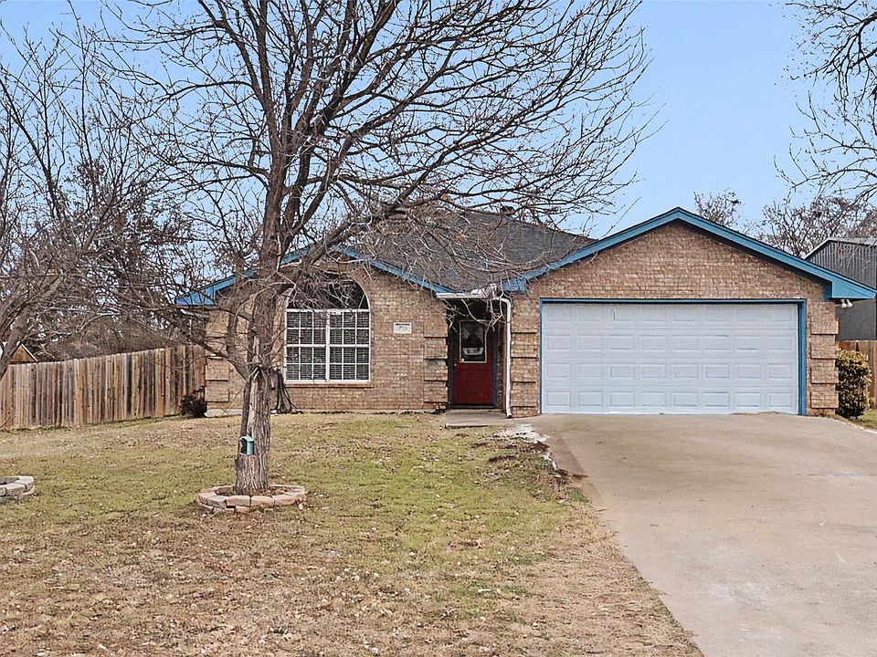 Open-concept 3-bedroom home on a large interior lot backing to a tree-lined greenbelt for added privacy. Features include vaulted ceilings, abundant natural light, and a 2-car garage. Updates include new (2026) LVP flooring in main living areas and a recently remodeled shared bath. Bright kitchen with tile countertops, stainless steel appliances, and adjacent formal dining. Primary suite offers chair rail detail, walk-in closet, and private bath. Secondary bedroom also includes a walk-in closet. Convenient laundry cabinetry. Private backyard with covered patio and storage shed.