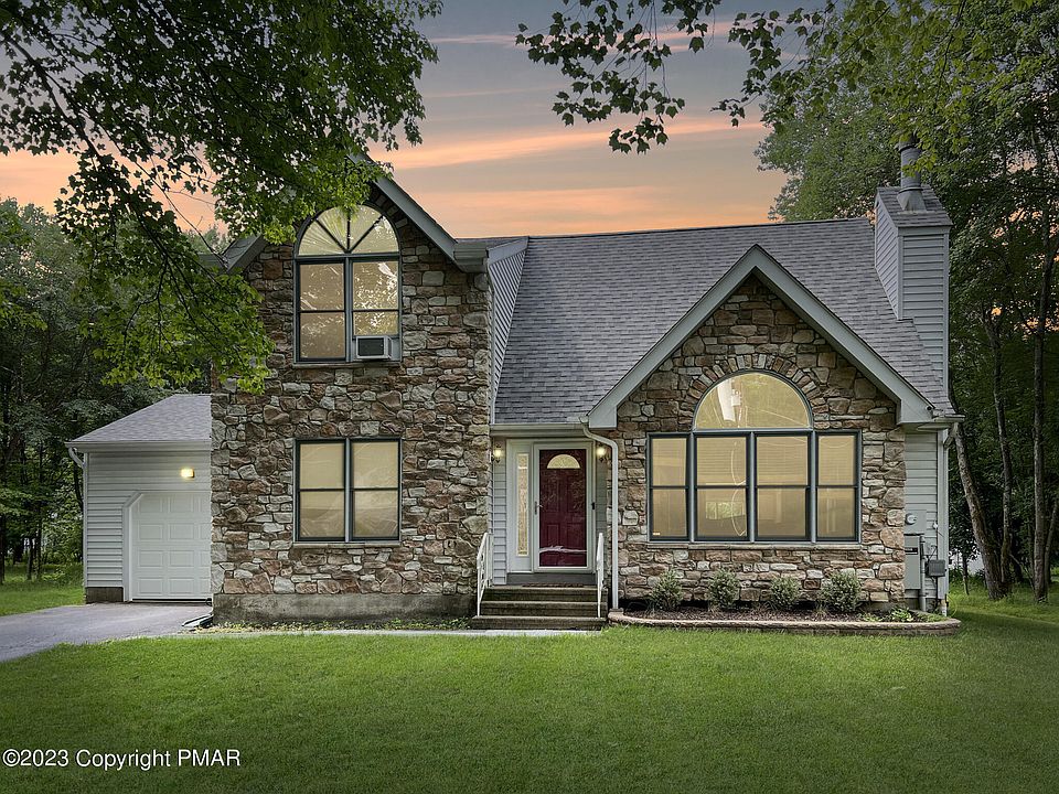 - Description: Stone Floor-to-Ceiling Fireplace | Vaulted Ceiling