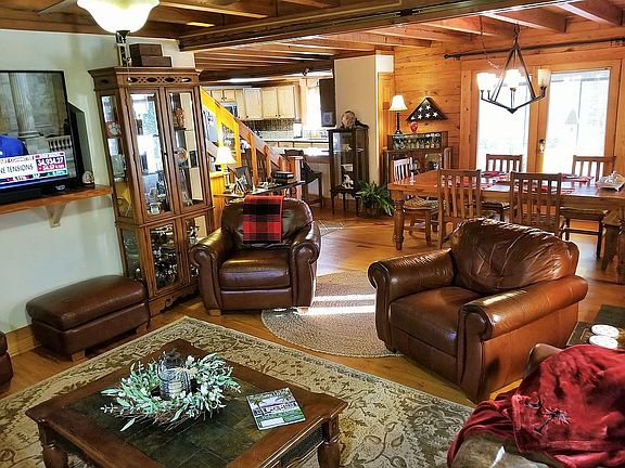 Private and convenient wooded retreat off Corley Mill Rd. - walk to the Saluda River. Log home with wrap-around porch on 3.59 acres. A creek runs along the back of the property. Close to downtown Lexington, Cola., interstates, and great schools (River Bluff High). Rooms upstairs - 3 bedrooms (master with woodstove) and 2 baths. Downstairs bdrm (used as a study) and 1 bath. Large rm and bath over 2 bay detached garage (ac window unit). Patio, decks, fire pit, and garden. The pool will need a new liner.