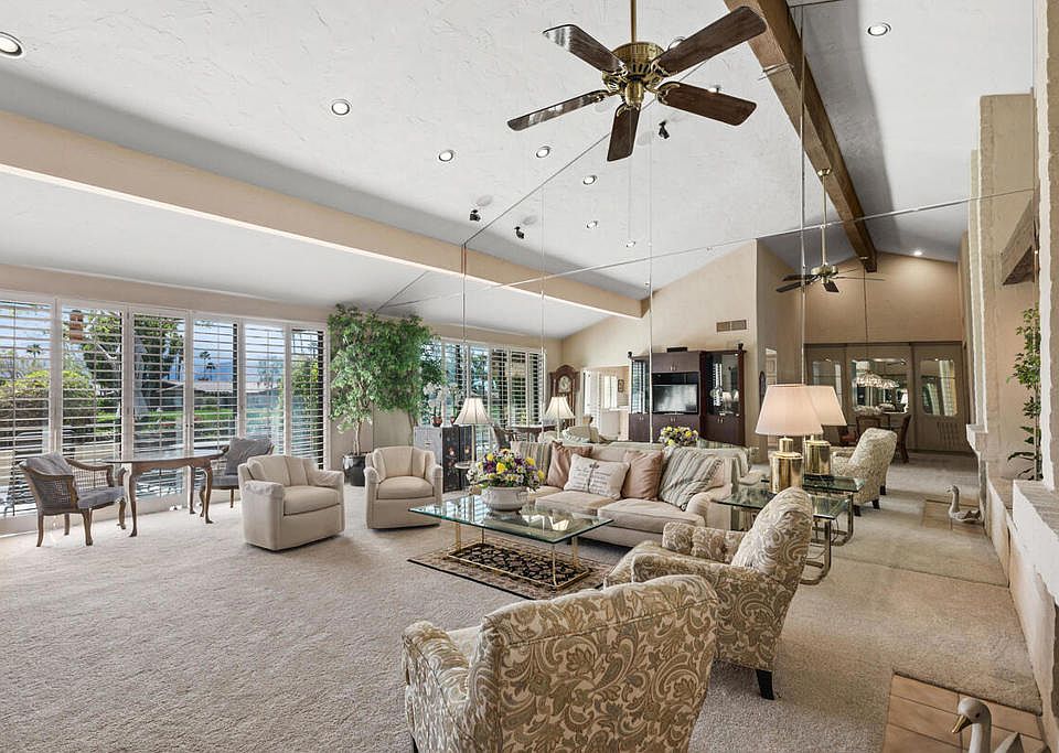 Welcome to The Lakes Country Club where this expanded Laramie plan is located on one of the most private streets in the community. The South-facing patio, with retractable awning, is situated on a beautiful fairway with unobstructed views of the Santa Rosa mountains. This 2,216 sq ft home offers 2 bedrooms, 3 1/2 bathrooms and a home office with enclosed atrium. The expanded great room and kitchen is light and bright, offering plenty of space for entertaining and enjoyment. Recent updates include two new A/C units, tankless water heater, garage door opener, porcelain tile flooring in entry, kitchen and bathrooms and new carpet in other living areas. This home is ready for your own personal touch and style. The Lakes Country Club is centrally located in Palm Desert, CA and offers a robust schedule of social and fitness activities at the new Clubhouse and sensational Health & Wellness Center. Enjoy Tennis, Pickleball or Pop Tennis, Bocce or any of the 44 community pools and spas. For Golfers, the Club offers membership options for the 27 hole championship golf course designed by Ted Robinson. Included furnishings per inventory list.