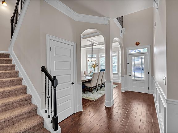 This beautifully upgraded home feels like new and showcases one of Crown's most sought-after floor plans with the primary suite conveniently located on the main level. The owner's retreat offers a vaulted ceiling, spa-inspired bath with a custom tile shower, relaxing soaking tub, dual vanities, and a generous walk-in closet. A dramatic two-story foyer welcomes you into the elegant dining room with coffered ceiling, wainscoting, and 5" plank hardwood floors throughout the main living areas. The great room also features a coffered ceiling, stone fireplace with gas logs, and opens seamlessly into the gourmet kitchen with granite countertops, travertine backsplash, 42" custom cabinetry, double ovens, Bosch dishwasher, center island, breakfast nook, and corner pantry. A powder room and spacious laundry are also on the main level. Upstairs you'll find a sunny loft plus three bedrooms, all with vaulted ceilings and walk-in closets. One bedroom has a private en-suite bath, while the other two share a Jack-and-Jill bath with separate vanities. Enjoy outdoor living on the covered patio overlooking the fenced backyard. Highland Parc is a walkable community with sidewalks, minutes from award-winning Riverside schools, shopping, dining, I-85, GSP International Airport, and East Riverside Park. Convenient to both downtown Greer and downtown Greenville. New roof in 2017