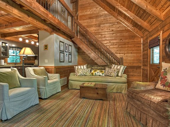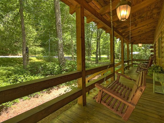 Cozy & Comfortable Creekfront Charmer is tucked away on private & level wooded tract just minutes from historic downtown area and walking distance to Lake Blue Ridge Day use area, marina & Toccoa River...newly remodeled and tastefully furnished, this meticulously maintained 2 bedroom + sleeping loft/2 bath authentic log cabins is situated just a "stones throw" from wide rushing creek with spacious layout, rustic wood interior, new stainless appliances, granite counters & updated throughout, bright remodeled bathrooms with tile shower, "sunny all season room" with rock floors, soothing stone fireplace in great room, rocking chair covered porches, lovely loft area, open kitchen/dining/living spaces, relaxing view of the mountains & water, great full time home or much needed getaway, perfect investment/vacation rental potential and more...mostly paved roads and easy access in scenic, rustic community, tastefully furnished for a turn key cabin...this one has it all!