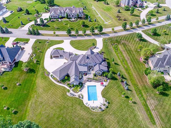 Welcome to this custom Sistevaris built home with every amenity you can think of. Situated on the Boulevard of Twin Eagles, this over 6000 sq ft home sits on a beautiful backdrop of trees and a pond. Everything that Sistevaris can do to a home is in this home beginning with the limestone that was hand picked from southern Indiana to the Brazilian mohogany custom door to the wood treatments and unique ceilings throughout the house. Upon entering the home, a spiral staircase to the second floor is tucked in to the left of the entrance. To the right is a formal dining with hand crafted pillars and limestone bases. The formal living room is draped in windows overlooking the pool and backyard bordered by a floor to ceiling stone two sided fireplace. The kitchen has all custom cabinets with dual ovens and six burner range with center island for enjoying guests while entertaining from the kitchen. The breakfast room is large enough to be a formal dining and enjoys the two sided fireplace. The three seasons room with sliding glass doors extends the entertainment to the outside allowing guests to come directly from the pool to a cool relaxing area for a quick snack or drinks. The family room is that basement you won't miss as it is on the main level and is divided into a movie room and a game room with wet bar. Just outside the game room is a covered porch with fireplace for enjoying those fall nights or grilling. This space can be closed off with barn doors. There is a half bath for guests enjoying the pool. The office/den with copper tin ceilings is tucked away at the entrance with glass barn doors. There is a laundry room off the master with laundry chute from the second floor. The master with vaulted wood ceiling has a 13x13 master bath with vaulted wood ceiling, walk in tile shower with dual shower heads and dual vanities. The master has a walk out to the patio. Upstairs are four bedrooms each with unique layouts and individual ceiling treatments. Two bedrooms share a Jack and Jill bath while two have their own baths. There is a multi-purpose room that replaces that need for a basement. No more sump pumps. Enjoy the pool and luxury at its best.