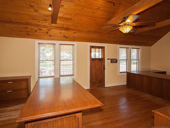 Office building ideally located 1 blk N of Main St, near several high-traffic businesses in Jenks. Property has great space for reception area or 3 offices along w/loft area, kitchenette, restroom, wood plank ceiling & real wood floors w/many updates.
