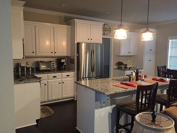 4 Bedroom, 2 Bath. Granite Countertops in kitchen and bathrooms. Refrigerator, Microwave, Stove, and Dishwasher to stay. Carpet, Hardwood, and Tile. Master bath has tile shower and garden tub. 10 ft Trey ceilings. Screen porch and covered patio in back. Attached garage.