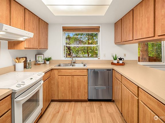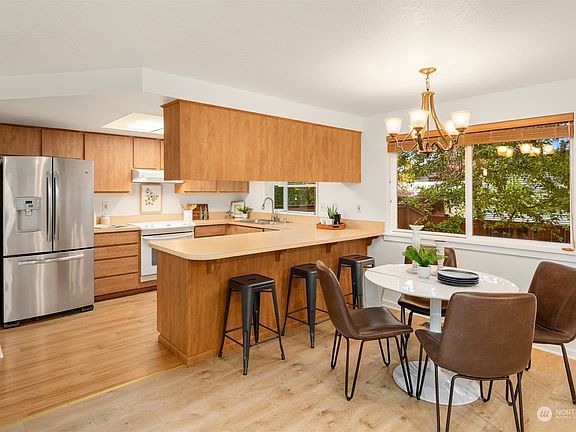 Move-in-ready rambler in a quiet and peaceful neighborhood of North Lynnwood. Enjoy the colors of fall on mature maple trees viewed from the front windows of the living room with cozy fireplace. Continue on to the open concept kitchen, dining and a secondary living space boasting large bay windows looking out on a designated green space and doors to backyard patio for outdoor entertaining & fully fenced backyard. Spacious 3 bedrooms with Primary ensuite! Live in comfort with air conditioning and work from home expertly with wired ethernet throughout the home. Peace-of-mind updates include: new roof, LVP flooring & interior paint! Conveniently located with easy access to I5, 405 & Alderwood mall!