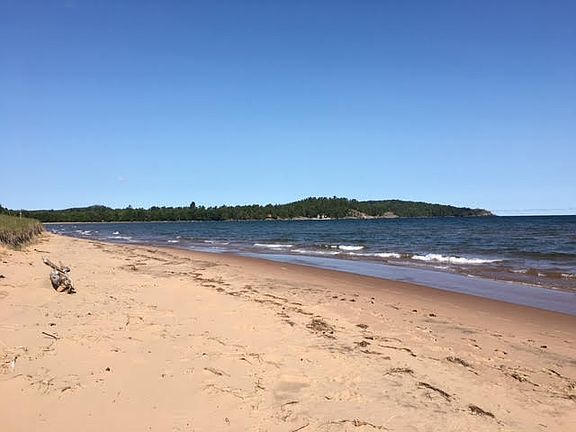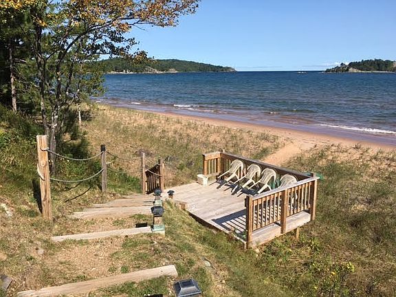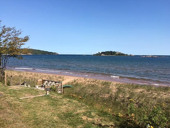 Live the life you've always dreamed of on the sandy shores of beautiful Lake Superior! Once in a lifetime opportunity to own the famed "Saint's Rest" Island Beach get away with your own private beach (177 ft. of frontage) overlooking the island, at the end of the dead end road with no traffic whizzing by, and on 1.28 acres! The home features 2 bedrooms: 1 upstairs overlooking the lake with windows on every wall, and one on the main level. The main level of the home captures the views from the kitchen, dining area and the large living room with library area; all large windows so you don't miss the waves crashing along the shores. One full bathroom and main floor laundry along with a partial basement for plenty of storage. The kitchen is nice sized and offers an island area with bar stools for casual entertaining and the dining room with plenty of room for a large table. Of course, who wouldn't want to dine and entertain outside with the various large wooden decks across the back yard and down to the beach area? The home is set at the back of the property with immediate beach access and at the front road side of the property you'll find the detached 528 sq. ft. pole building/garage that can certainly house all your toys plus has a studio apartment with small kitchenette and living area. Many original amenities to the home with beautiful woodwork and flooring and lots of history you can't find anywhere else. The home also has the newer touches we all love such as a Nest thermostat, newer flooring in the kitchen and roof 8 years ago. Home has been currently used as a successful and lucrative VRBO. Grab your own piece of luxury or investment property quickly!