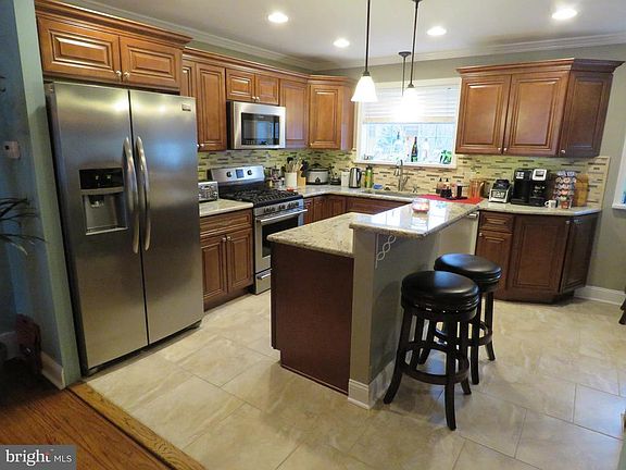 Large beautiful row home in nice area. Completely redone home. Refinished hardwood floors in living and dining room. Crown molding. Stunning Kitchen with top of line cabinets, granite countertops and custom tile floor and back splash. Stainless appliances. Custom iron spindles on all staircases. Finished basement with billiard and TV area. Pellet Stove provides plenty of warm heat. Slider to completely pavered rear yard with outside sink, pond and gas fire pit. Master bedroom has hardwood flooring, full wall double closets. Master bath completely redone with tiled shower with stone peddle floor. Hall bath remodeled including new bath. Two linen closets in hall. Two other good size bedrooms with double closets and crown molding.