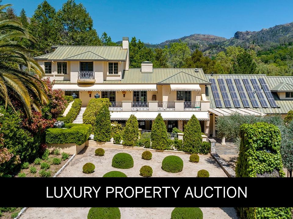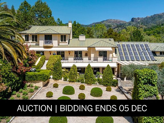 Chateau Paradis is a magnificent French-inspired estate offering an unparalleled Wine Country lifestyle in the rolling hills of Calistoga. Settled on over four acres of lush, meticulously landscaped gardens, this secure retreat offers both privacy and grandeur. Built in 1994 and extensively renovated in 2015, the property boasts 5,379 square feet of combined living space, including a 4 bedroom/5 bathroom main residence with a caterers kitchen, a pool house,guest house, and a yoga studio. The primary residence radiates European elegance with exquisite Italian crystal chandeliers, limestone and oak hardwood floors, and a chef's kitchen with an upscale La Cornue gas range. The estate is designed for effortless year-round entertaining, featuring an outdoor kitchen with an oversized outdoor dining table in the heart of the garden, great for family gatherings and weddings. The guest house, which is situated at the top of the property, provides stunning views of the Palisades Mountains from the adjacent terrace. A true legacy property, Chateau Paradis offers the ultimate in refined Napa Valley living.