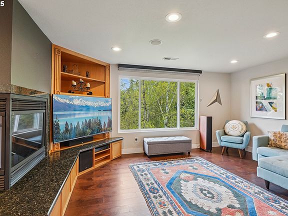 Step into this stunning contemporary home featuring a beautifully open layout and an attached ADU with a private entrance. A versatile bedroom or den on the main floor offers flexible living options, perfect for guests or a home office. The inviting living room boasts a wall of windows that flood the space with natural light while offering serene views of the private backyard. A cozy gas fireplace with a wraparound hearth adds warmth and character. The spacious deck off the dining room is ideal for relaxing evenings or entertaining guests, with a seamless indoor-outdoor flow. Downstairs, the luxurious primary suite includes double sinks, a soaking tub, walk-in shower, and a generous walk-in closet. Two additional bedrooms, a full guest bath, and a large family room/theater room complete the lower level—perfect for movie nights or casual lounging. The attached ADU offers its own private entrance and includes a well-equipped kitchen, comfortable living room, bedroom, and full bathroom—ideal for extended family, guests, or rental income potential. The main house and ADU come fully furnished complete with all appliances, TV's and a high end theater system. Located directly across from Spring Garden Park and just minutes from the charming shops and cafes of Multnomah Village, this home also provides quick access to I-5 for an easy commute. A rare blend of style, space, and location—this home truly has it all. ADU 3-D scan available to view in RMLS or by clicking exterior 360 views of main house scan. [Home Energy Score = 2. HES Report at https://rpt.greenbuildingregistry.com/hes/OR10237379]