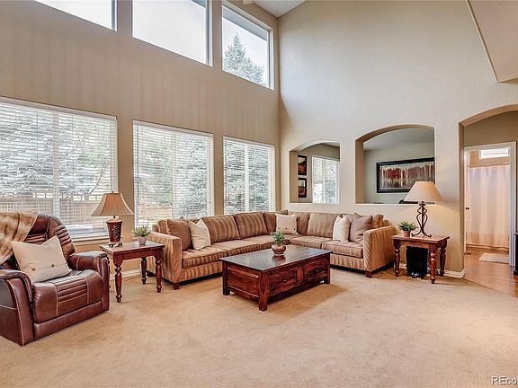 Located on a corner lot in sought-after Highlands Ranch Golf Club, this beautiful home is sure to impress. The warm and welcoming open floor plan is filled by natural light and enhanced by its soaring ceilings. Enjoy hosting private gatherings in the adjoining formal dining and living rooms. Prepare impressive meals in the spacious gourmet kitchen with double ovens, generous breakfast bar and eating area with a built-in desk. Flowing from the kitchen is a stunning family room with a media nook and stone fireplace. Exit through the sliding glass door onto the partly covered private patio and enjoy the beautifully landscaped backyard. Work from home or curl up with a good book in the office/library. A full bath, mud room and a tandem three-car garage complete the main level. Retreat upstairs to the peaceful primary suite with its own private patio, two walk-in closets and a 5-piece bath with a water closet. The upper level also includes two additional bedrooms, a Jack & Jill bathroom and built-in study space. An impressive lower level equipped with ample space for entertaining, pre-wired for surround sound, wine refrigerator, and plenty of room for storage in the utility room. Special features include: hardwood floors, newer carpet throughout, newer interior paint, tile roof, and A/C. Close to all the best Highlands Ranch amenities and trails including Redstone Park, Towne Center, many restaurants, and access to the Highlands Ranch Golf course (Homeowners receive discounted rates).