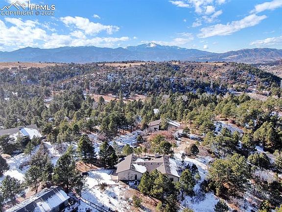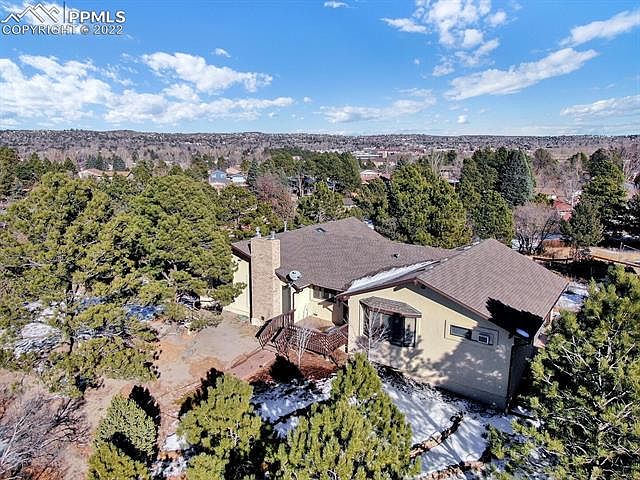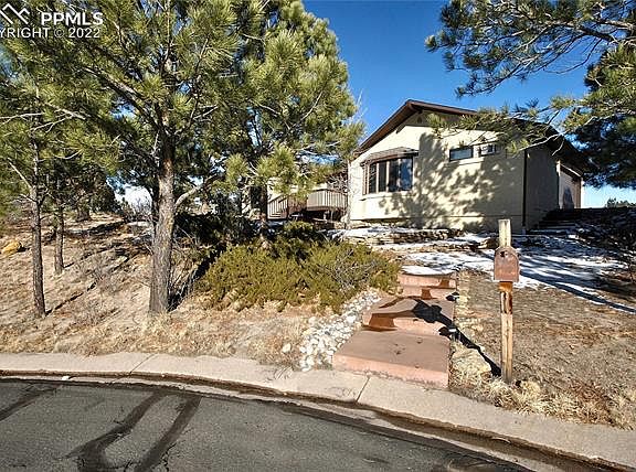 HARD TO FIND!! Rancher with all main level living and walkout basement. Almost 1/2 acre lot of trees, scrub oak and sandstone with Outstanding Pikes Peak and Palmer Park Views. The 2 car garage & shop are huge with full electric and tons of shelving. Inside greets you with large tile entry into cozy living room or go around to large family room with built in book shelves that joins kitchen and dining areas. Pella windows and super modern heat and hot water system with stucco exterior. The spacious master has huge closet and private bath. Walkout basement has second fireplace, darkroom, a cellar and plenty of room to expand. Close to CSCC and Downtown.