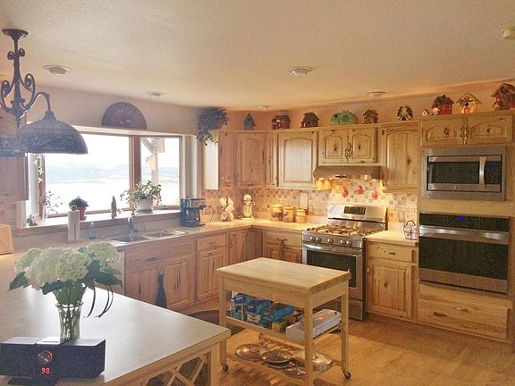 A jewel overlooking the Lake. No better view lot anywhere as this home features expansive lake views from the inlet to dam, the city of Trinidad and all 3 mountain landmarks in the area. Quality construction and finishes. The main floor features a large kitchen with hickory cabinets, bay window looking out to the lake, built-in oven and microwave, wet bar, and breakfast bar. An office/craft room, large laundry room with large sink, 1/2 bath, open dining area within the living room with high ceilings and a beautiful rock, floor to ceiling dual facing fireplace. Large master bedroom with fireplace, a 5 piece master bath with double sinks and garden tub looks out to stunning front range views. The lower level features a family room, 2 large bedrooms, full bath, a man cave and 2 storage rooms