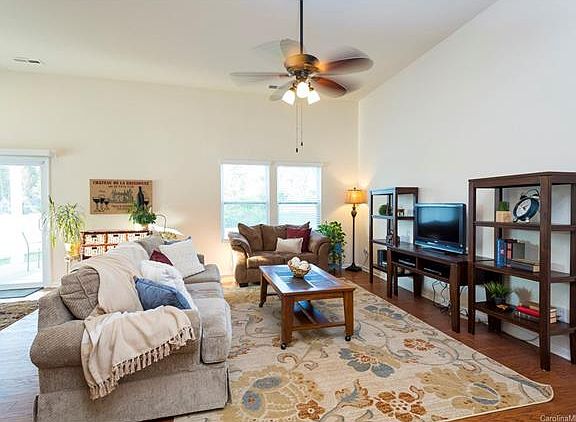 Sought after ranch plan w/soaring, vaulted ceilings. Not even three years "young"-practically brand new. Hardwd floors, granite, stainless, extra recessed lights, ceiling fans, & many more upgrades. Master ste separate from all addi'l bedrooms & features upgraded add'l windows, dual sinks, garden tub, & large walk-in closet. Covered rear patio perfect for cool fall evenings. Deep bkyard backs to pvt common area. Very easy access to I-485 & just minutes to new Riverbend Village Shopping Area.