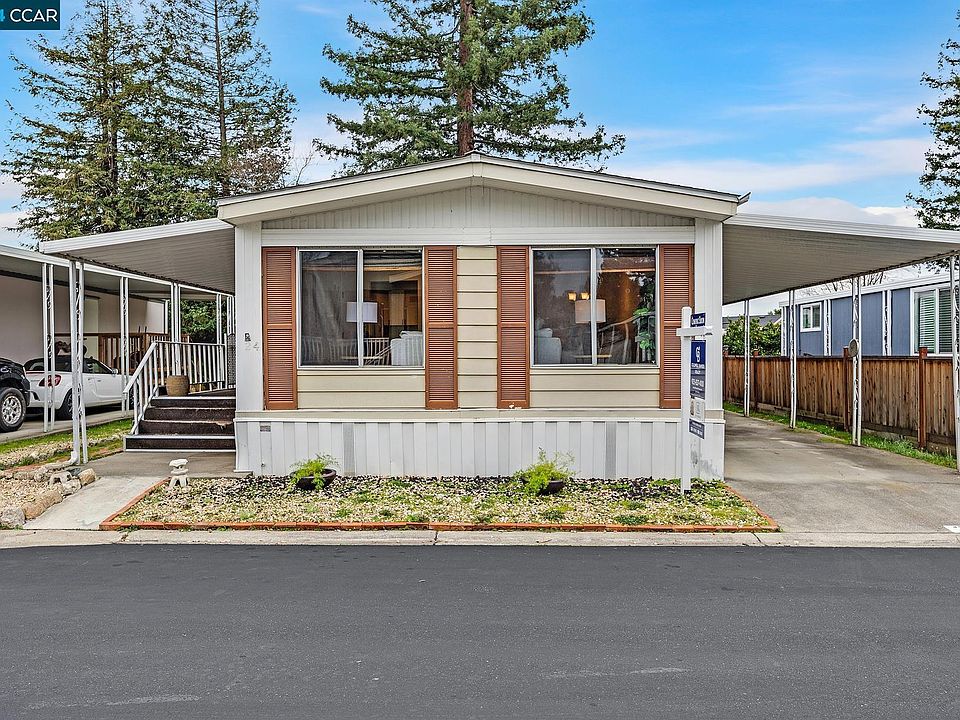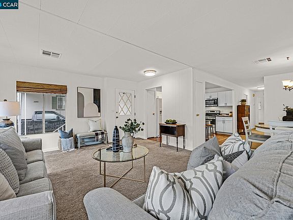 Welcome to this beautiful mobile home, ready for its new owners! The spacious family room is bathed in natural light, creating a warm and inviting atmosphere that seamlessly flows into the dining room. The open-concept kitchen is a chef's dream, boasting updated white cabinetry, recessed lighting, and a stylish peninsula perfect for casual seating and entertaining. The primary bedroom, situated at the back of the home, offers privacy and tranquility. It features a large walk-in closet and an updated ensuite bathroom complete with a walk-in shower and a sleek white vanity. Centrally located, the convenient laundry room is close to the kitchen, adding to the home's practical layout. An additional bedroom and bathroom provide a comfortable space for guests or can be utilized as a home office or hobby room. Outside, you'll find a newer roof, covered carport and a shed, offering ample additional storage space. This welcoming community will make you feel right at home with its array of social activities and stunning pool where you can meet and mingle with neighbors. The quiet neighborhood is just a stone's throw away from Downtown Pleasanton, giving you easy access to shopping, restaurants, and a variety of activities. Welcome home!