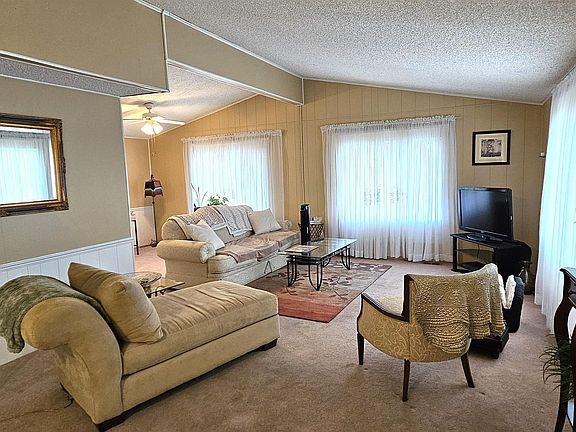 Great opportunity! Motivated Seller!! Rare find! Unit with private, fenced backyard and no rear neighbors! Bring your ideas to make it yours! Enjoy one story living in this 2 bedrooms and 2 bathroom mobile home with 1344 sqft. living space, built in 1984. Open floor plan encompassing kitchen/living/dining/family room combo. Vaulted ceiling, lots of dual pane windows, laminate flooring, carpet, ceiling fans. Large open living room with two windows. Adjoining dining room with sliding glass door leading to front porch. Well equipped kitchen, incl. refrigerator, range oven, dishwasher, breakfast bar counter and lots of cabinets and counter space. Good sized master bedroom featuring large closet with mirrored sliding doors, laminated flooring, ceiling fan. Adjoining master bathroom with built-in sink vanity large mirror, walk-in stall shower plus bathtub. Extra bedroom for guests or office. Hall bath: vanity with large mirror, shower over tub. Laundry Room with cabinets, Washer/Dryer included AS-IS. Long, covered driveway. Storage shed. 2010 dual pane windows (except baths+laundry), 2013 New roof, 2018 Water Heater, Furnace and AC, Stove. 2021 outside paint. 2022 Refrigerator. SENIOR 55+ park - monthly fee $1,968 incl. lot fee and a long list of amenities and activities.