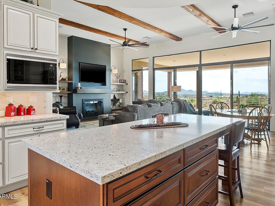 Fantastic mountain and city light views! This gorgeous custom house boasts the best of everything. Huge 1,314 square foot oversized garage w/epoxy flooring & tons of storage. The gourmet kitchen offers high end appliances including Wolf and Viking, soft close custom cabinets with hardware and pullouts topped with fabulous granite counters. Custom window coverings which are electric and battery operated w/ remotes/wall controls and can be controlled by your smart phone. This 4 bedroom and 4 bath home includes 2 master suites, all split! Main level has wood beams and fireplace open to kitchen along with a sprawling balcony with grill area. You will enjoy the amazing sunsets and sunrise from here. Downstairs also offers a kitchen & living area along with a wall of glass to a walk out patio.