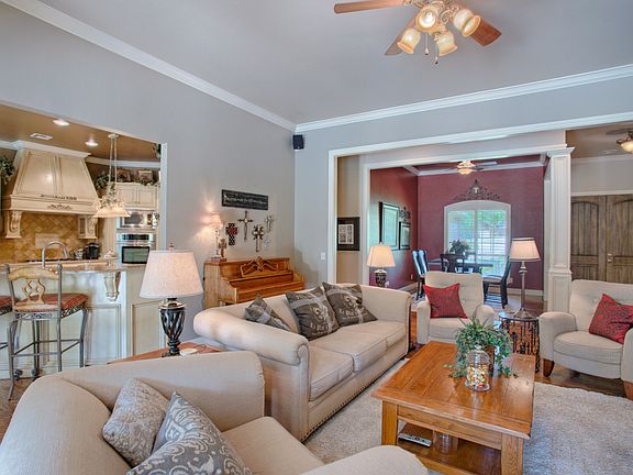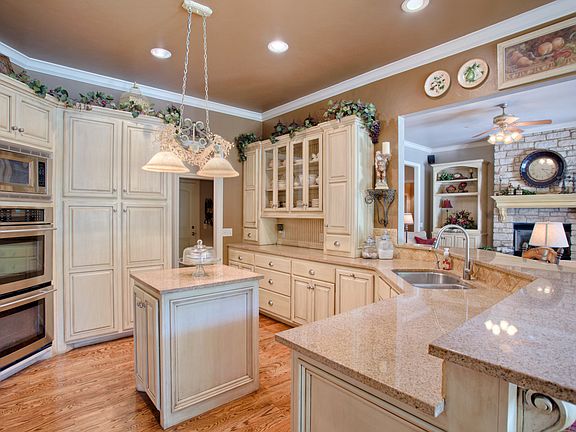 Beautiful landscaping, wooded views with creek surround this 2-story home. Spacious living, media, office and formal dining. Large kitchen w/ stainless appliances and breakfast bar. Dual sinks and ovens with built-in microwave. Master downstairs with Jetta tub, shower, dual vanity and spacious walk-in closet. 3 car garage w/ storm shelter. Spacious fenced yard & workshop. Covered patio & pergola, salt water pool with water feature. Beautiful!