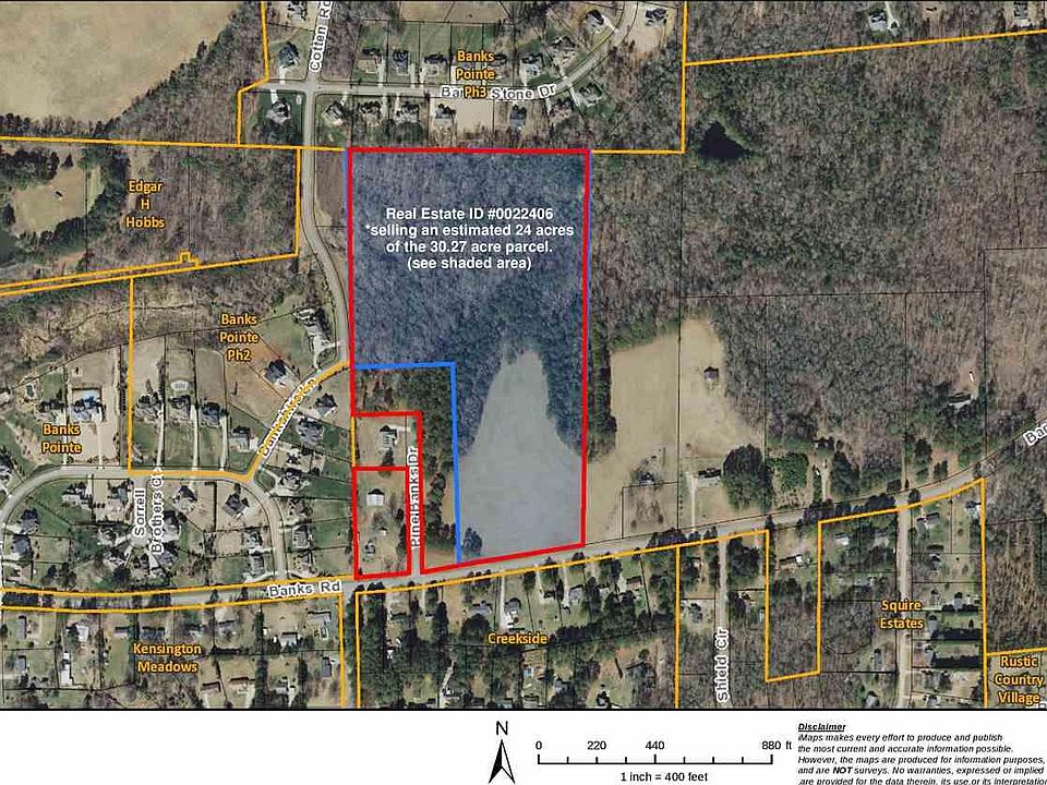 Owner is selling an estimated 24 acres of the 30.27 acre tract. There are about 6 acres of pasture & the remaining acreage is wooded. There is about 500 feet of road frontage along Banks Rd. Nicely situated with Banks Pointe subdivision & close to NC HWY 401.