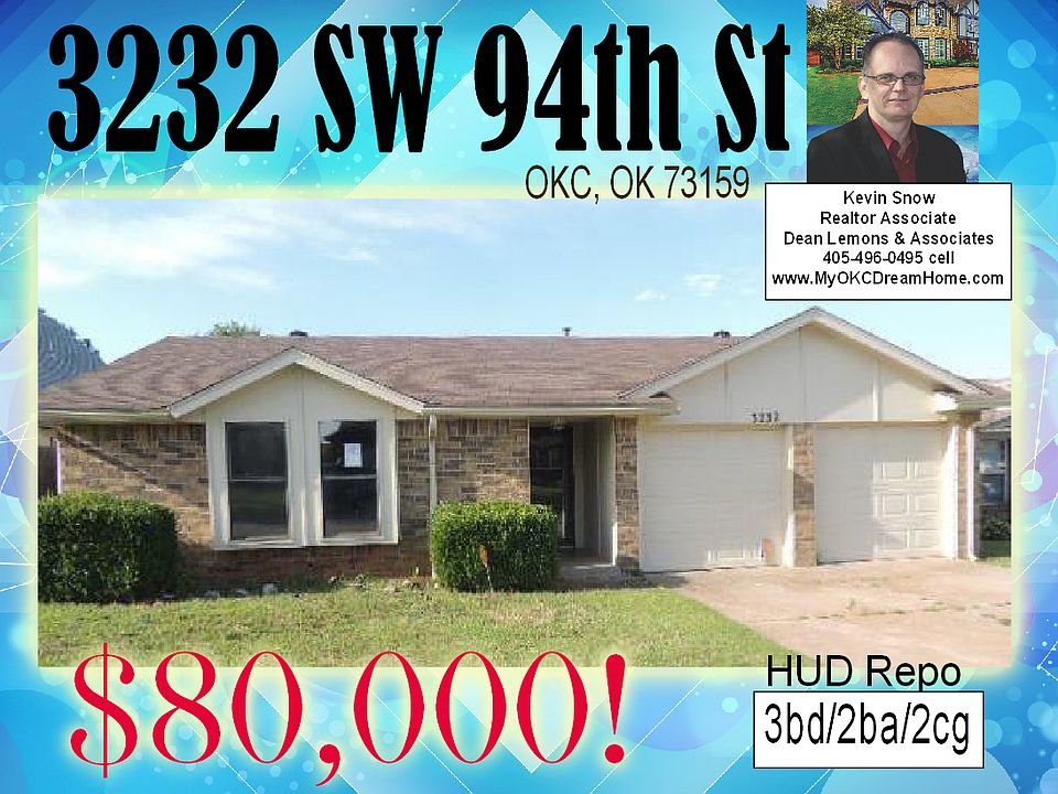 HUD FORECLOSURE available to OWNER OCCUPANT BIDDERS ONLY! Makes a great starter home in Moore schools! Call Kevin Snow today for your private showing and to place your bid at 4054960495! Bidding expires July 10 at midnight!