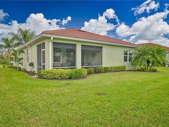 DO NOT CONTACT SELLERS! NO FLOOD ZONE HERE!!! Welcome to your dream home in the beautiful 55+ community of Cascades at River Hall. The LOW HOA of $343 a month covers your Cable & Internet, all your lawn care needs, clubhouse with resort style heated pool and hot tub, Pickleball, Tennis and Bocce courts, a State-of-the-art fitness facility and yoga studio and LOADS of social activities to keep you busy all year long. This single-family home offers the perfect blend of comfort, style, and functionality. Step inside this 2 Bed + Den home and be greeted by the stunning features that make this home truly exceptional. The office space is perfect for those who work from home or need an extra bedroom. The granite counters and ALL NEW BLACK stainless KITCHEN appliances (Extended 3-year warranty) add a touch of sophistication and BRAND-NEW Quartz Counters added in the bathrooms with New Custom Shower doors. Custom curtains, blinds and fans throughout the home add a personal touch and provide privacy when needed. The newly installed engineered wood flooring in the bedrooms adds warmth and charm to the living spaces. Imagine waking up to breathtaking lake views and enjoying the most incredible sunsets from your own backyard. The tinted windows not only enhance the aesthetic appeal of the home but also provide energy efficiency and protection from harmful UV rays. The master bedroom is a true retreat with a custom barn door that adds a rustic touch to the space and two walk in closets. Don't miss the opportunity to make this house your home. All driveway and Lanai pavers have been professionally cleaned and sealed, this home is well maintained, and it SHOWS! Experience the luxury and tranquility of living in Cascades at River Hall, where every day feels like a vacation.