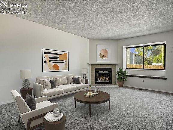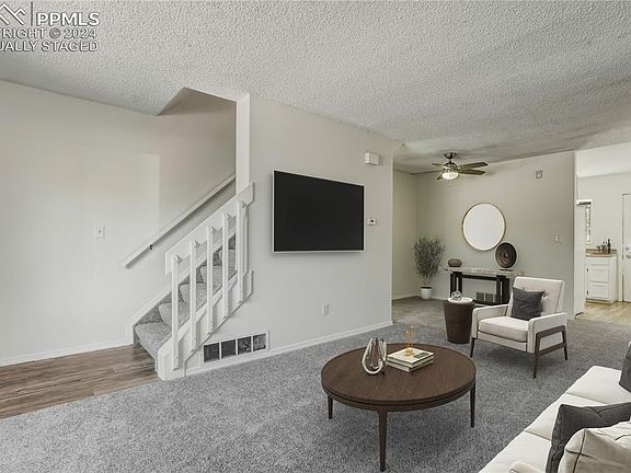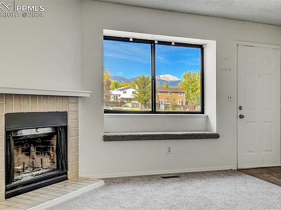This updated townhome nestled in the SE backs to community greenway, offers Pikes Peak views, comfort, convenience & modern amenities throughout. All new carpet & interior paint! Located in the desirable Pinehurst Station. Walking distance to Deerfield Park & Turman Elementary, shopping, entertainment, military bases, Amazon, airport & main roads. The entry opens to luxury vinyl plank wood floor landing that leads into the bright & open great room. The great rm features all new paint and plush carpet, wood burning fireplace w/ tile surround, & window seat w/views of Pikes Peak. The adjoining dining space has easy access to the kitchen. The kitchen boasts painted cabinets, includes appliances range/oven, dishwasher, & refrigerator. From here walk-out to the fenced, concrete private patio w/ storage and opens to community greenway. Upstairs has 2 large bedrooms, both have their own attached private full bath. One of the rooms has a great view of Pikes Peak and the mountains. Downstairs has a flexible lower-level bedroom/family room w/all new carpet & paint. Large storage room for all your extra items. Additional highlights include reserved parking space, high-speed internet, HOA maintained landscaping & more! See it today.